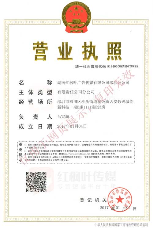 湖南紅楓葉傳媒深圳分公司營業(yè)執(zhí)照