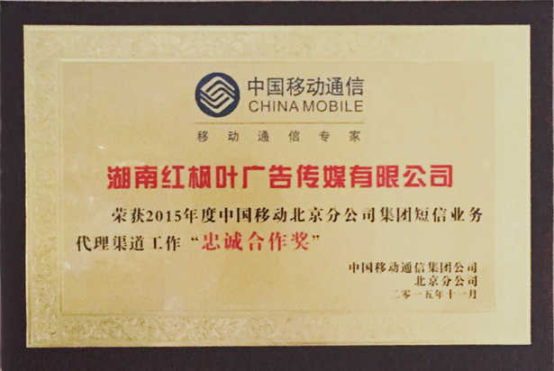 2016年度中國移動(dòng)通信“忠誠合作獎(jiǎng)”